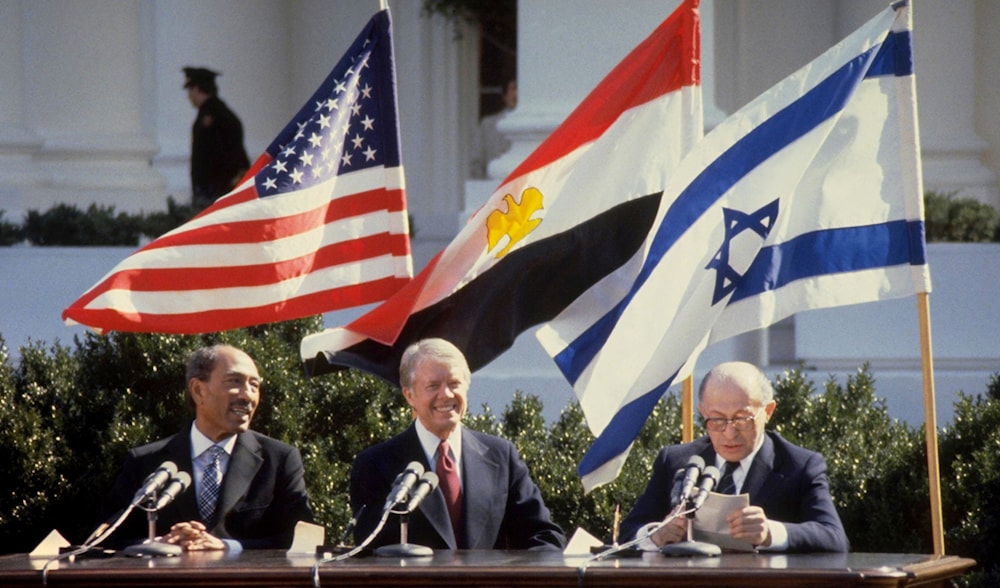 الرئيس الأميركي جيمي كارتر مع الرئيس المصري أنور السادات ورئيس الوزراء الإسرائيلي مناحيم بيغن (1979).