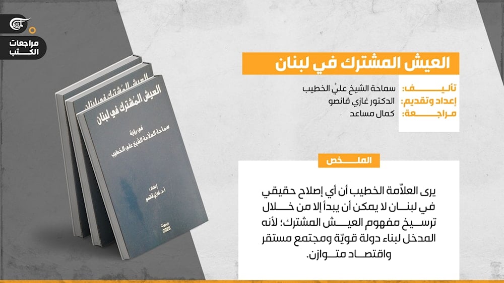يرى العلاّمة الخطيب أن أي إصلاح حقيقي في لبنان لا يمكن أن يبدأ إلا من خلال ترسيخ مفهوم العيش المشترك؛ لأنه المدخل لبناء دولة قويّة ومجتمع مستقر واقتصاد متوازن وإنماء يعمل. وبالتالي، فإن تحقيق العيش المشترك ليس مجرد شعار، بل هو خطة عمل تتطلّب إرادة سياسية حقيقية، وتعاوناً بين مختلف الفئات وتغييراً جذرياً في بعض المفاهيم السائدة. إن رؤية العلامة الشيخ علي الخطيب للعيش المشترك تشكّل خريطة طريق لبناء لبنان المستقبل، حيث يتساوى جميع المواطنين في الحقوق والواجبات، بعيداً من التصنيفات الطائفية الضيّقة، الكتاب هو دعوة إلى تجاوز الخلافات السياسية والطائفية والعيش المشترك، هو قناعة راسخة بأن لبنان لا يمكن أن يستمر إلا بوحدة أبنائه، وبالعمل المشترك من أجل مستقبل أكثر استقراراً وعدالة وانماءً وازدهاراً.