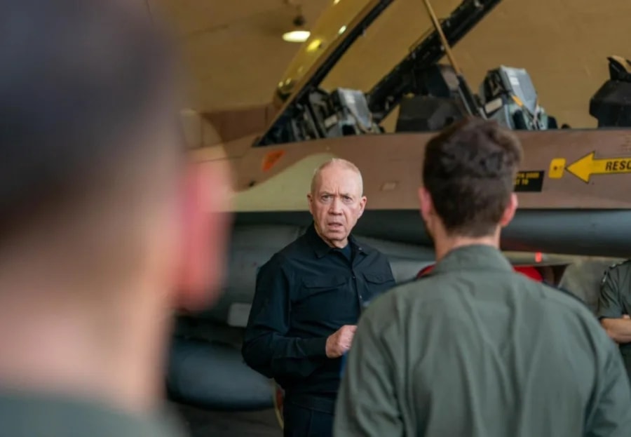 وزير الأمن الإسرائيلي السابق يوآف غالانت في قاعدة "رامات دافيد" التي استهدفها حزب الله خلال "طوفان الأقصى" (إعلام إسرائيلي)